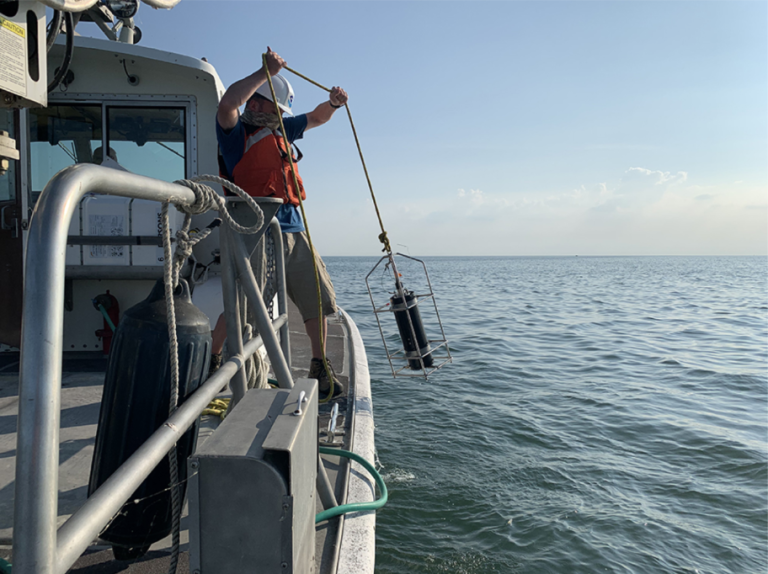 Figure 3: A NOAA scientist collecting water samples in Lake Erie to help forecast and monitor a HAB